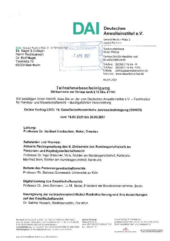 Ausgewählte Probleme des Personen- und Kapitalgesellschaftsrechts (März 2021)